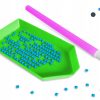2. Znajdź woreczek z kryształkami w odpowiednim kolorze. Delikatnie go otwórz (tylko uważaj żeby nie rozsypać diamencików… są naprawdę małe). Przesyp troszkę koralików (nie wszystkie) na dołączoną do zestawu tackę.  Potrząśnij nią teraz delikatnie, przez co kamyczki ułożą się zaokrągloną stroną ku górze, ułatwiając tym samym ich przyklejanie.